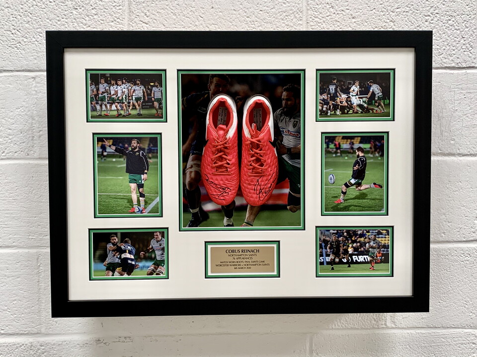 The pair of boots worn by Cobus Reinach on his very last appearance wearing the Black, Green and Gold of Northampton Saints. The boots are signed by Cobus and presented in a fantastic frame to keep them safe for posterity. A truly individual and personal item.